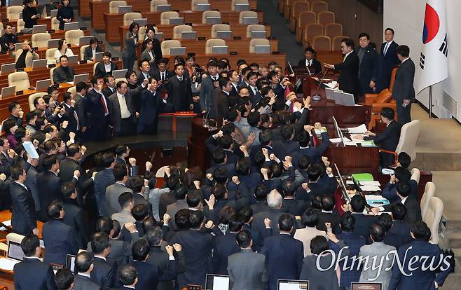 | ▲ 우원식 의장에게 항의하는 국민의힘 지난해 12월 27일 우원식 국회의장이 국회 본회의에서 한덕수 국무총리 탄핵소추안 가결 의결정족수에 대한 설명(재적의원 과반수 찬성)을 하자 국민의힘 의원들이 항의하고 있다. 결국 이날 한 총리 탄핵안은 국민의힘 의원들이 퇴장한 끝에 찬성 192명으로 가결됐다. |