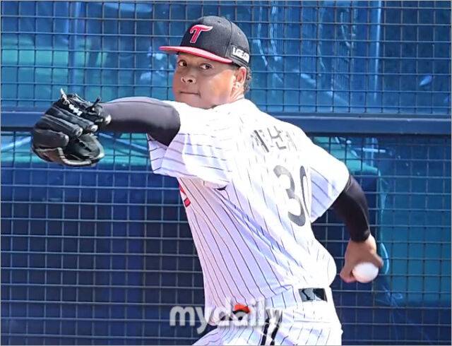 22일 서울 잠실야구장에서 열린 '2025 신한 SOL BANK KBO리그' 롯데 자이언츠와 LG 트윈스 개막전 경기 전 LG 에르난 데스가 투구 훈련을 했다.