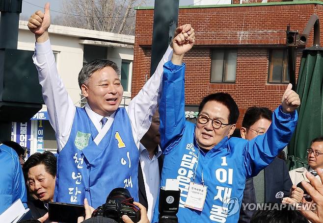 (담양=연합뉴스) 정다움 기자 = 더불어민주당 박지원 의원이 22일 오전 전남 담양군 중앙공원 사거리에서 이재종 후보 지원 유세를 하고 있다. 2025.3.22