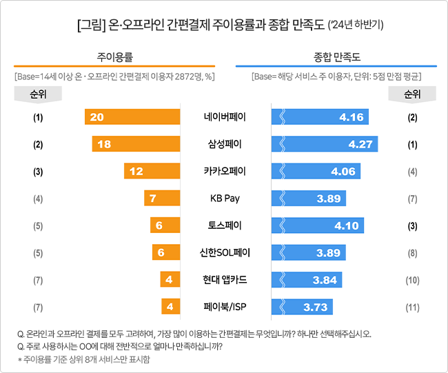 KB페이(7%), 토스페이·신한SOL페이(각 6%), 현대앱카드·페이북/ISP(각 4%)가 뒤를 이었다. KB페이와 신한SOL페이가 전년 대비 2%포인트씩, 현대앱카드 페이북/ISP는 1%포인트씩 줄면서 ‘톱3 쏠림’ 현상이 심화했다는 분석이 나온다.
