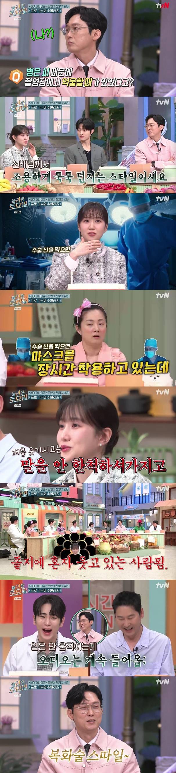 박은빈은 "선배님께서 조용하게 툭툭 던지는 스타일이다. 수술 신을 찍으면 마스크를 쓴 채로 최소 6시간에서 10시간 이상씩 촬영했는데 이 상태에서 저를 웃기시고는 자꾸 말을 안 한 척 해서 나 혼자 웃고 있는 이상한 사람이 됐다"라고 말했다.