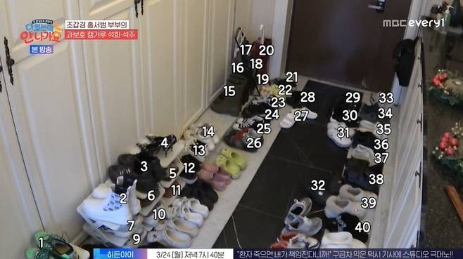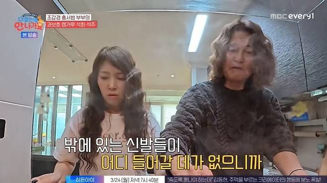 조갑경은 아침을 준비하다 "신발장 보면서 열받았다"라고 열을 올렸고, 홍서범은 "누구 신발이 제일 많은데. 이사할 때 채워놓고 한번도 안 치우지 않냐. 들어갈 데가 없다. 애들 거랑 내 건 하나도 없다"라고 반박했다.