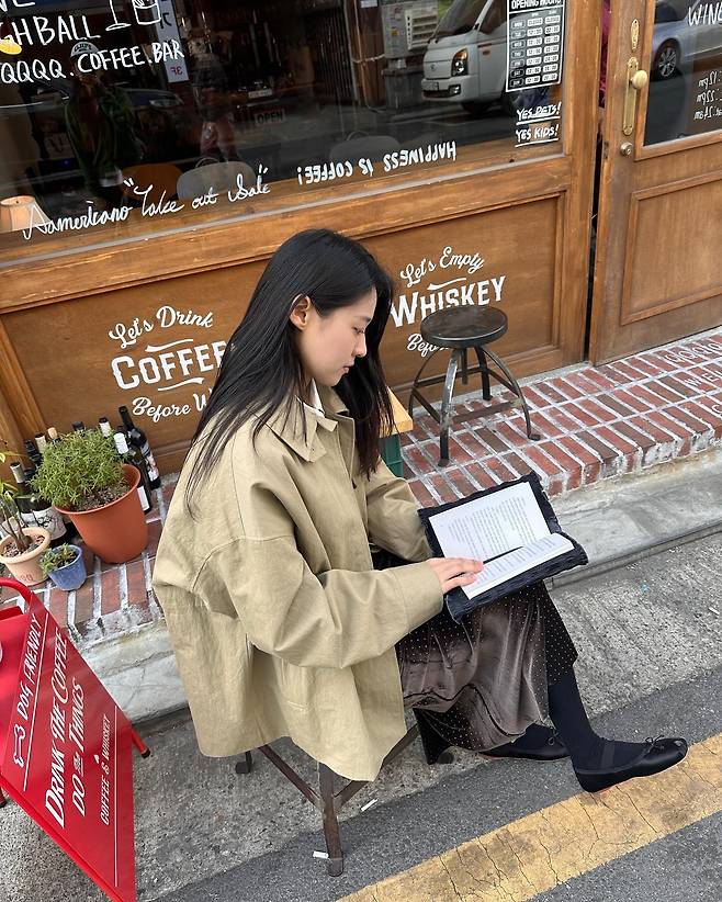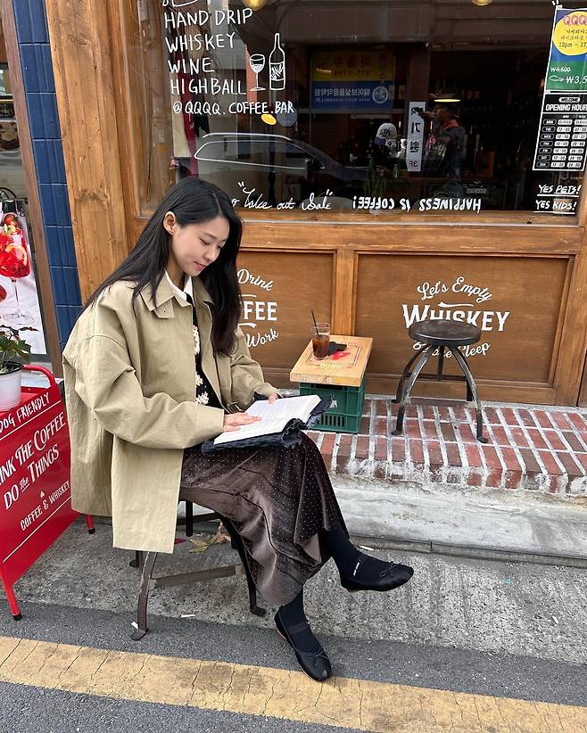 사진 속 설현은 카페 앞 거리에서 책을 읽으며 청순한 매력을 자랑했다.