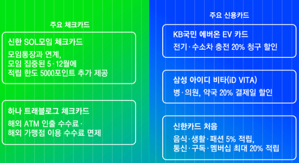 신한카드가 최근 신한은행 ‘SOL모임통장 서비스’ 오픈에 맞춰 출시한 ‘SOL모임 체크카드’는 모임장이 SOL 뱅크 앱에서 모임을 개설한 후, 기존 입출금 계좌를 연동하거나 새로운 SOL모임 통장을 만들면 되는 방식이다. 이 카드는 다양한 분야 적립 혜택과 모임이 많은 달엔 추가 한도를 부여하는 게 특징이다. 국내외 결제 시 건당 최대 1%를 마이신한포인트로 적립해 주며, 특히 행사와 모임이 집중되는 5월과 12월은 적립 한도를 5000포인트 추가 제공한다.