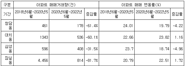23일 신한투자증권 자산관리컨설팅부가 국토교통부 실거래가를 토대로 잠삼대청에 대한 토허제가 시행된 2020년 6월을 기준으로 직전 2년(2018년 6월~2020년 5월)과 직후 2년(2020년 6월~2022년 5월)의 아파트 매매량을 조사한 결과, 거래량은 4개 지역에서 모두 감소한 것으로 나타났다.