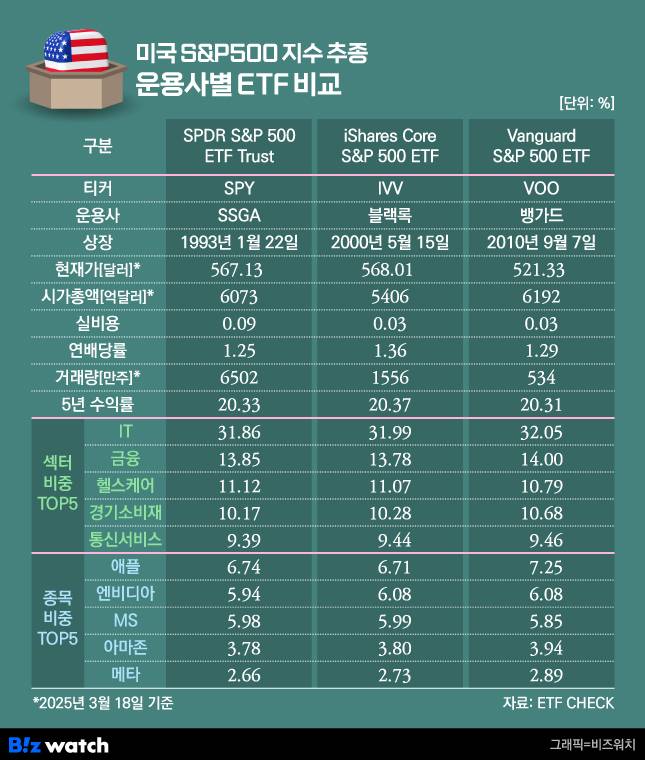 SSGA, 뱅가드, 블랙록 모두 세계적인 자산운용사인데요. 이들이 만든 S&P500 ETF는 같은 지수를 추종하는 만큼 외형상 큰 차이가 없다고 볼 수 있습니다.