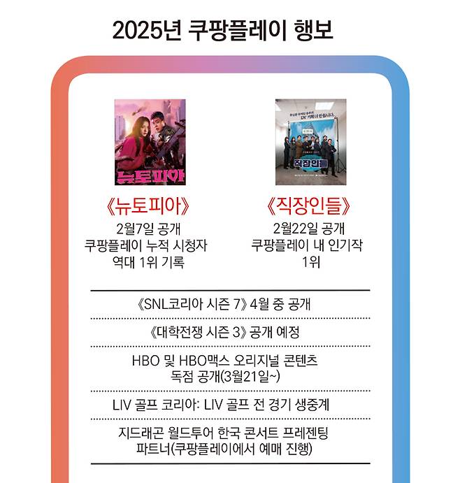2월초 공개한 《뉴토피아》는 쿠팡플레이 시리즈 누적 시청자 역대 1위(론칭 후 10일 기준)를 기록했다. 아마존 프라임 비디오에서도 공개된 이 작품은 전 세계 TV 시리즈에서 5위를 차지하는 등 좋은 성적을 내고 있다. 쿠팡플레이는 2월22일 공개한 오피스 코미디 《직장인들》에 이어 《SNL코리아 시즌 7》 《대학전쟁 시즌 3》 등을 연내 공개한다는 계획이다. 콘텐츠 경쟁력 강화를 위해 워너브러더스 디스커버리와 파트너십을 맺고, 3월21일부터 《왕좌의 게임》 《하우스 오브 드래곤》 등 HBO·HBO맥스 작품도 선보이기 시작했다.