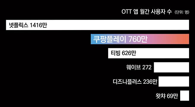 최근작에 호응이 이어지면서, 2월 기준 쿠팡플레이의 월간활성이용자(MAU) 수는 760만 명을 기록했다(와이즈앱·리테일). 넷플릭스(1416만 명)에 이어 2위다. 티빙(626만 명)을 앞서면서 토종 OTT 중에서는 1위를 차지했지만, 넷플릭스와의 격차 줄이는 여전한 과제로 남아있다.
