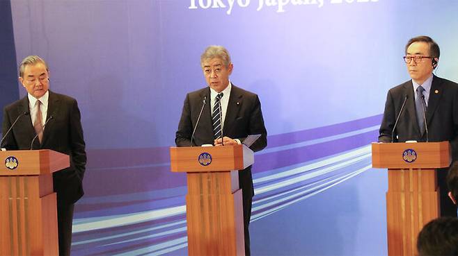 ▲ 조태열 외교부 장관(오른쪽), 왕이 중국 공산당 중앙외사판공실 주임 겸 외교부장(왼쪽), 이와야 다케시 일본 외무상이 22일 도쿄 외무성 이쿠라공관에서 한중일 외교장관 회의를 한 뒤 기자회견을 하고 있다.