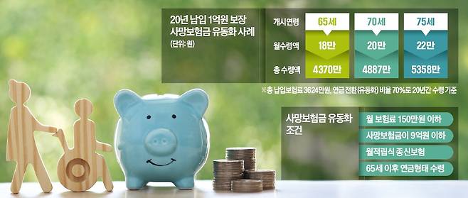 죽은 뒤 유족 등이 받던 사망보험금을 본인이 살아 있을 때 연금 형태로 받는 ‘사망보험금 유동화’ 제도가 올해 시작된다. 사후 소득인 사망보험금을 생전에 쓸 수 있도록 해 노후 생활을 지원하겠다는 취지다. 1억원짜리 사망보험금 중 70%를 연금으로 전환하면 20년간 매월 20만원 안팎의 연금을 수령할 수 있다. 유족들은 계약자가 사망한 뒤 남은 보험금 3000만원을 받는다.