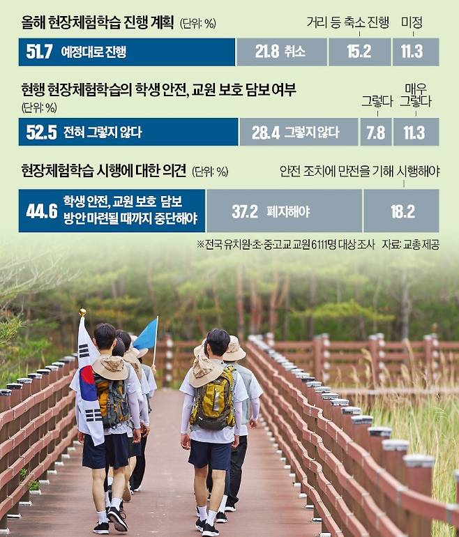 23일 교육계에 따르면 현장학습을 취소하거나 연기하는 학교가 늘고 있다. 한국교원단체총연합회가 지난 14일부터 18일까지 전국 유치원·초·중·고교 교원 6111명을 대상으로 진행한 설문조사에 따르면 올해 현장체험학습을 계획대로 하는 학교는 51.7%에 그쳤다. 이동 거리를 줄여 진행하는 곳은 15.2%, 취소 또는 보류한 곳은 21.8%였다. 11.3%는 아직 결정하지 못했다고 답했다.