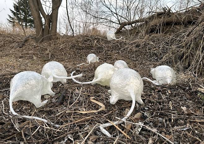 | ▲ 바깥미술 두물머리전 ‘잇’(2024년 1월29일~2월14일)에 출품한 ‘끔찍한 상상3’(비닐쥐). |