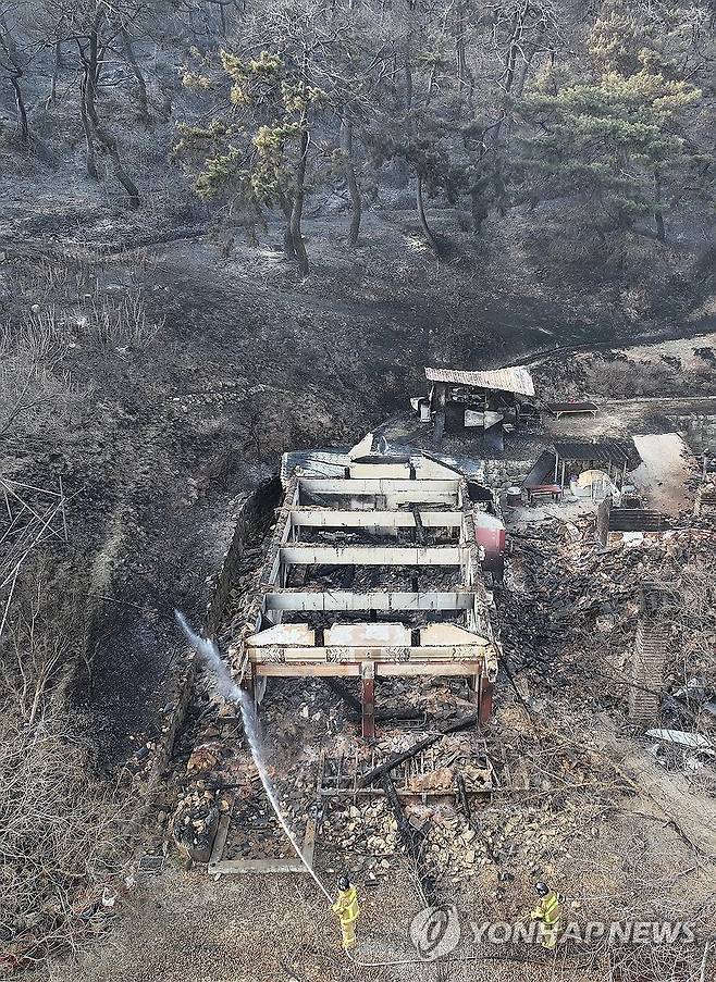 (의성=연합뉴스) 윤관식 기자 = 경북 의성군 대형 산불 발생 이틀째인 23일 의성군 안평면 신안리 운람사와 인근 산림이 산불에 폐허가 된 가운데 소방대원이 잔불 진화작업을 하고 있다. 2025.3.23