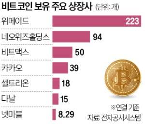 23일 한국경제신문이 지난 21일까지 사업보고서를 공시한 국내 상장사 3955곳을 분석한 결과 15곳(연결 기준)이 가상자산을 보유했다. 비트코인을 보유한 상장사는 위메이드(223개), 네오위즈홀딩스(94개), 넷마블(8.29개) 등 게임사가 많았고, 코스닥시장 상장사 비트맥스(50개), 카카오(39개), 다날(15개) 등도 있었다.