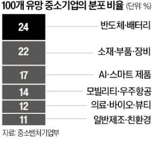 분야별로는 반도체와 배터리 분야가 전체 기업의 24%로 가장 많았다. 소재·부품·장비(22%), 디지털 인공지능(AI)·스마트 제품(17%) 등이 그 뒤를 이었다. 티에스아이와 덕산실업, 부강테크, 고려기연, 포스콤 등이 해당 분야에서 100대 유망 중소기업으로 뽑혔다.