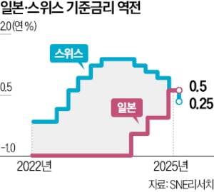 스위스 중앙은행(SNB)은 지난 20일 기준금리를 연 0.5%에서 연 0.25%로 내렸다. 인플레이션 압력이 낮아진 데 따른 것으로, 금리 인하는 다섯 차례 연속이다. 일본은행(BOJ)은 19일 기준금리를 연 0.5%로 유지했다. 이에 따라 일본 기준금리는 스위스보다 높아졌다. 일본 기준금리가 세계 최저를 탈피한 것은 스위스가 금리 인상 기조를 접은 2022년 9월 이후 처음이다.