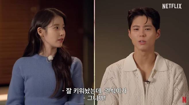 공개된 영상엔 '폭싹 속았수다'의 두 관식 박보검과 박해준, 두 애순 아이유와 문소리가 3막의 하이라이트 금명과 영범(이준영 분)의 상견례 장면을 시청하는 모습이 담겼다.