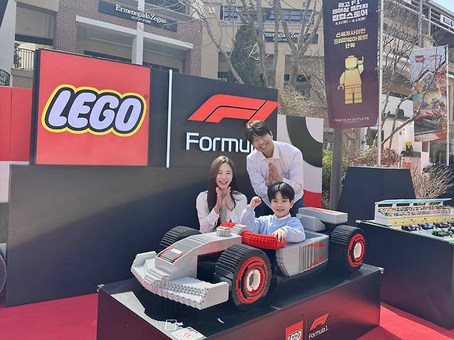 23일 홍보모델들이 경기 파주 프리미엄아울렛 센트럴 스퀘어에서 레고코리아와 함께 포뮬러 원(F1)을 주제로 꾸민 팝업스토어 포토존에서 기념촬영을 하고 있다.