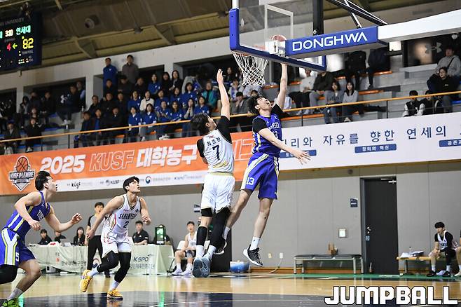 동국대가 지난해 역전패의 악몽을 씻었다. 단국대에게 1쿼터부터 12-19로 밀렸다. 2쿼터가 끝났을 때 동국대 점수는 22점에 그쳤다. 3쿼터에 한재혁과 임정현의 3점 슛이 터졌다. 공격이 내외곽의 조화를 이루며 40-41로 3쿼터를 마쳤다. 4쿼터는 25-12로 압도했다. 동국대는 이날 터뜨린 7개의 3점 슛 중 6개를 3쿼터 이후에 넣었다.