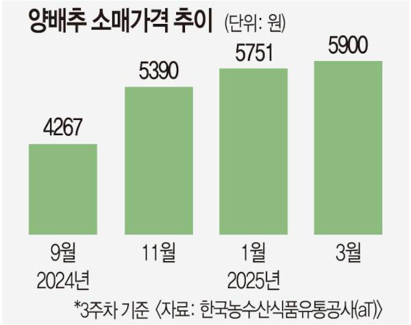 배추 가격도 지난해보다 재배 면적이 줄면서 50% 비싸졌다. 겨울 양배추와 배추 생산량은 지난해보다 10% 안팎 감소했다. 부족해진 국내 공급량을 채우기 위해 수입량도 증가했다. 관세청에 따르면 지난달 양배추 수입량은 5839t으로 지난해 같은 기간(413t)의 14배에 이른다.
