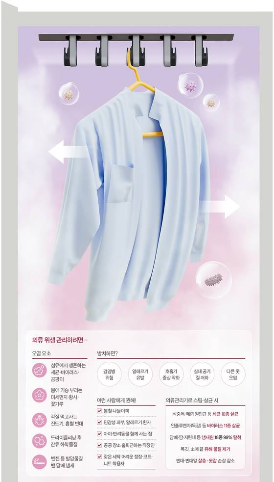 대부분의 감염병은 기침이나 손을 통해 전파된다. 흔한 감염 경로다. 그런데 의류를 통한 전염 가능성도 있다. 옷은 공기 중을 떠다니는 세균이나 바이러스와 같은 보이지 않는 위험에 노출돼 있다. 이에 대응해 안 보이는 오염을 잡아내는 기술이 발전했다. 고온 스팀으로 살균하는 의류관리기(스타일러)가 대표적이다. 코로나19 대유행을 겪으며 의류관리를 위생 습관으로 보는 흐름이 뚜렷해졌다.