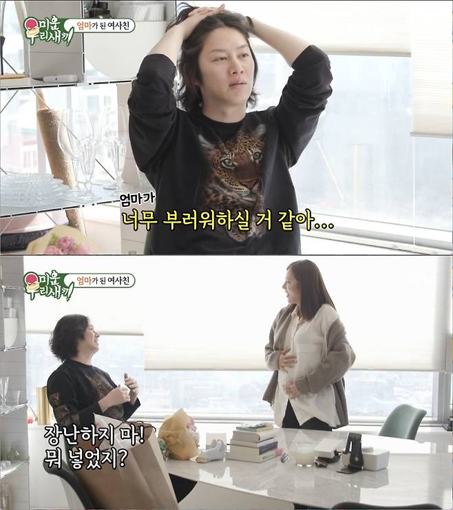김희철은 "난 이게 미안한 얘기지만 방송에 안나갔으면 좋겠다"라며 "우리 엄마 이거 보고 나면은 옛날부터 며느리로 점 찍어뒀던 우리 담비가 곧 출산이라는 것까지 알면 너무 부러워할 거 같다"라 했다.