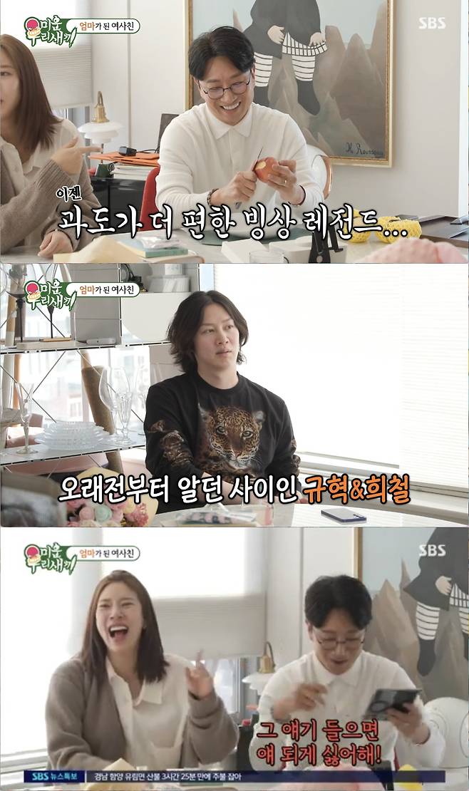 김희철은 "형 옷 입는 스타일도 바뀐 거 같다. 아빠 느낌이다"라며 반가워 했다. 얼굴도 결혼 전보다 훨씬 좋아진 이규혁에 김희철 어머니는 "부럽지?"라며 놀려 웃음을 자아냈다. 이규혁은 "손담비 과일을 먹어야 하는데"라며 당이 적은 과일들을 직접 깎아 대령했다.