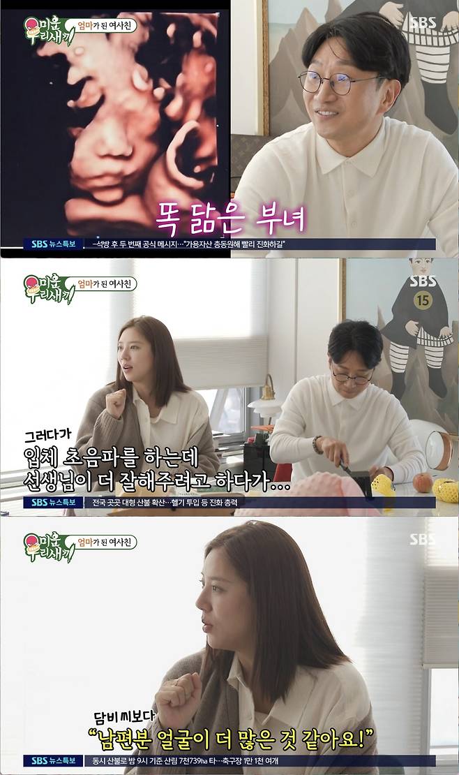 '첫 딸은 아빠 닮는다는데'라는 김희철에 이규혁은 "그게 이슈가 있었다. 성별은 처음엔 모르지 않냐. 그런데 정황상 아들인줄 알았다"라 입을 열었다. 손담비는 "그런데 입체 초음파를 하는데 선생님이 더 잘해주려고 하다가 '담비씨 모습은 얼굴 없고 남편분 얼굴이 더 많은 거 같아요' 한 거다"라 했다. 김희철ㅇ느 "선생님이 실례하셨네"라 해 웃음을 자아냈다.