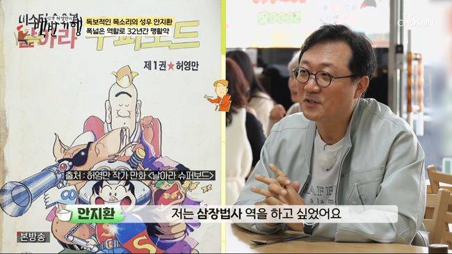 안지환은 성우의 직업병에 대해 “아이들을 데리고 영화를 보러 가면 영화에 집중하는게 아니라 캐릭터를 분석해서 가상 캐스팅을 하게 된다”고 말했다. 특히 안지환은 “일을 진짜 많이 했다. 지금이면 딱 좋은데 조금 더 욕심 부리면 제 이름으로 된 프로그램도 만들고 싶다. 어떻게 보면 허영만이 내 롤모델”이라며 ‘백반기행’을 탐냈다.