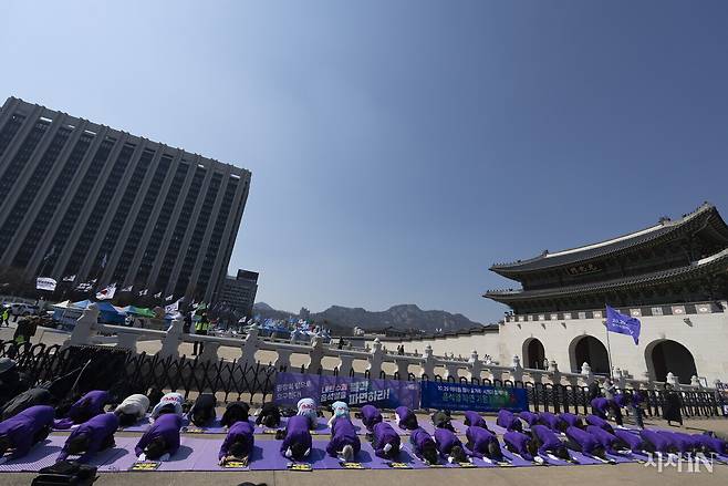 3월19일 오후 서울 광화문 월대 한편에서 이태원 참사 유가족과 시민들이 종소리에 맞춰 절을 올렸다.