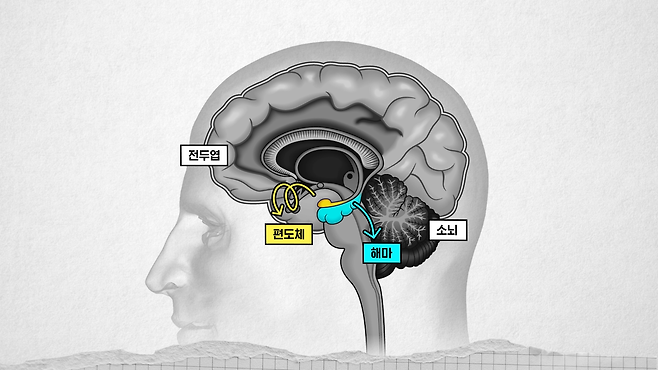 또 하나는 기억이라는 게, 우리 뇌가 이렇게 전두엽이 거죽, 그리고 이게 소뇌고 이게 전두엽이에요. 그럼 전두엽과 소뇌 사이를 담당하는 피질 하 구조가 있어요. 건축물로 치면 일종의 토대 공사를 담당하는 영역과 같은 건데 여기를 변연계라고 부르거든요. 그런데 그 변연계가 인간의 어떤 공포나 불안을 담당하는 편도체. 아몬드 모양의 편도체와 기억을 담당하는 해마가 위치해 있어요. 그런데 그게 바로 정서 뇌라는 거죠.