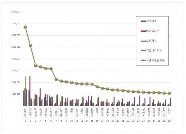 트로트 가수 브랜드 평판 1위를 기록한 임영웅은 참여지수 130만7253, 미디어지수 148만7016, 소통지수 250만7816, 커뮤니티지수 141만9300을 기록했다. 합산한 브랜드평판 지수는 672만1385로 분석됐다.