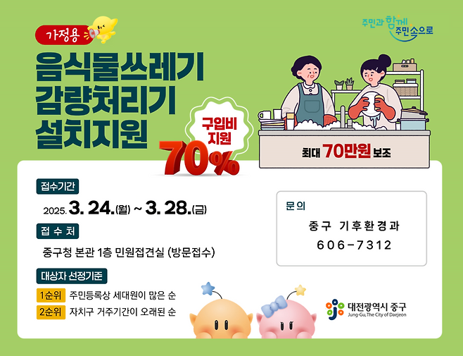[대전24시] 중구, 가정용 음식물처리기 구매비 지원...구매 비용 70%·최대 70만원 지원