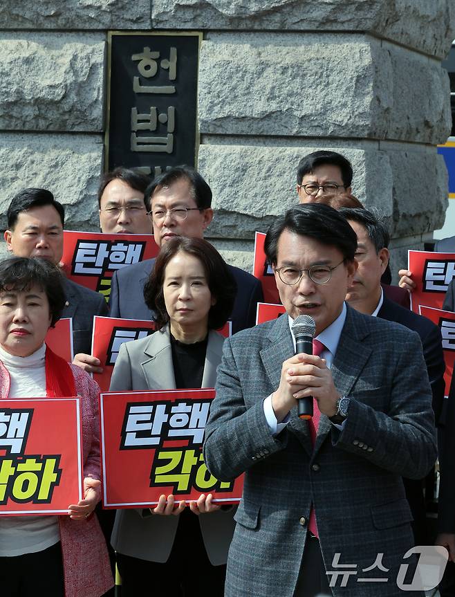(서울=뉴스1) 박정호 기자 = 국민의힘 윤상현 의원이 24일 오전 서울 종로구 재동 헌법재판소 앞에서 열린 한덕수 국무총리 탄핵심판 선고 결과에 대한 기자회견에서 발언을 하고 있다. 2025.3.24/뉴스1