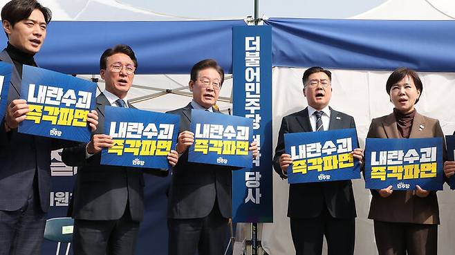 ▲ 더불어민주당 이재명 대표, 박찬대 원내대표 등 위원들이 24일 서울 종로구 경복궁 인근에서 열린 현장최고위원회의에 앞서 천막당사 현판식에서 손팻말을 들고 있다.