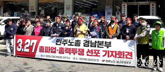 민주노총 경남본부(본부장 김은형)는 24일 국민의힘 경남도당 앞에서 "헌재의 즉각적인 윤석열 파면을 촉구하는 총파업을 선언한다"라고 밝혔다.