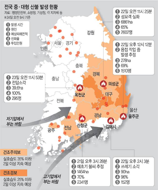 전국에 동시다발적으로 발생한 산불이 진화되지 않은 와중에 26일까지 동쪽 지역을 중심으로 대기가 건조해지고 강한 바람이 불 것으로 보여 산불 진화에 난항이 예상된다. 작은 불씨에도 ‘큰불이 나기 쉬운’ 기상 조건이 갖춰지면서 각별한 주의가 요구된다. 건조한 대기와 강풍, 적은 강수량 등이 이번 산불의 원인으로 분석된 가운데 건조한 날씨를 해소할 비는 27일부터 예보됐다.