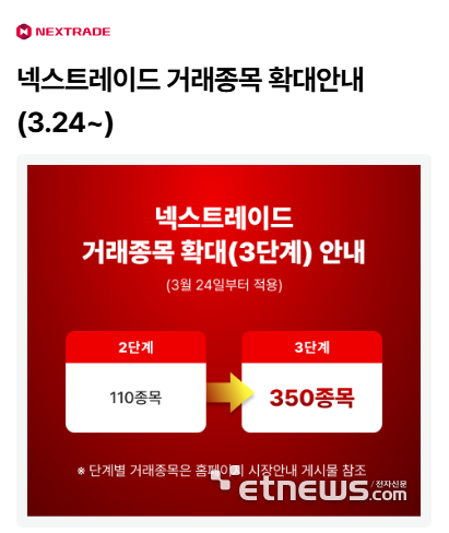 24일 넥스트레이드는 매매체결대상종목을 기존 110종목에서 350종목으로 확대했다.