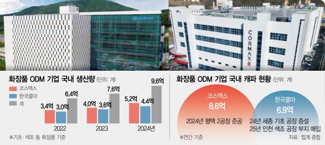 화장품 제조자개발생산(ODM) 업계의 양대 축인 한국콜마(161890)와 코스맥스(192820)가 지난해 처음으로 국내에서 약 10억 개의 화장품을 생산했다. 전년 대비 약 2억 개 늘어난 것으로, K뷰티에 대한 수요 급증에 맞춰 적극적인 생산능력(캐파) 확충에 나선 결과로 풀이된다. 최근 한국콜마가 인천에 신규 공장 설립을 위한 부지를 매입하는 등 양사 모두 몸집을 더욱 키우는 한편 초격차 기술을 앞세워 실적에 가속도를 붙인다는 계획이다.