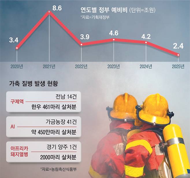 실제로 2017년 정부는 전남 해남과 충북 음성 등에서 AI가 발생해 3000만마리 이상의 닭과 오리를 살처분하며 농가 피해가 확산하자 예비비 1687억원을 투입했다. 2010~2011년엔 대규모 구제역이 발생해 예비비만 1조원 넘게 지출했다.