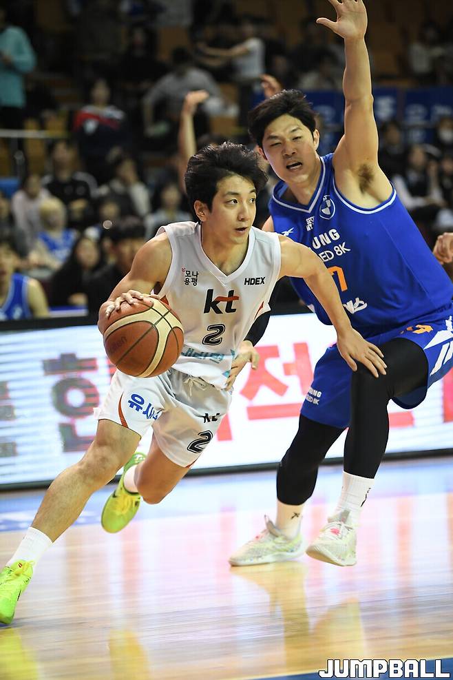[점프볼=잠실/유용우 기자] 24일 잠실실내체육관에서 열린 2024-2025 KCC 프로농구 서울 삼성과 수원 KT의 경기, KT 허훈이 인사이드로 파고들며 돌파하고 있다.