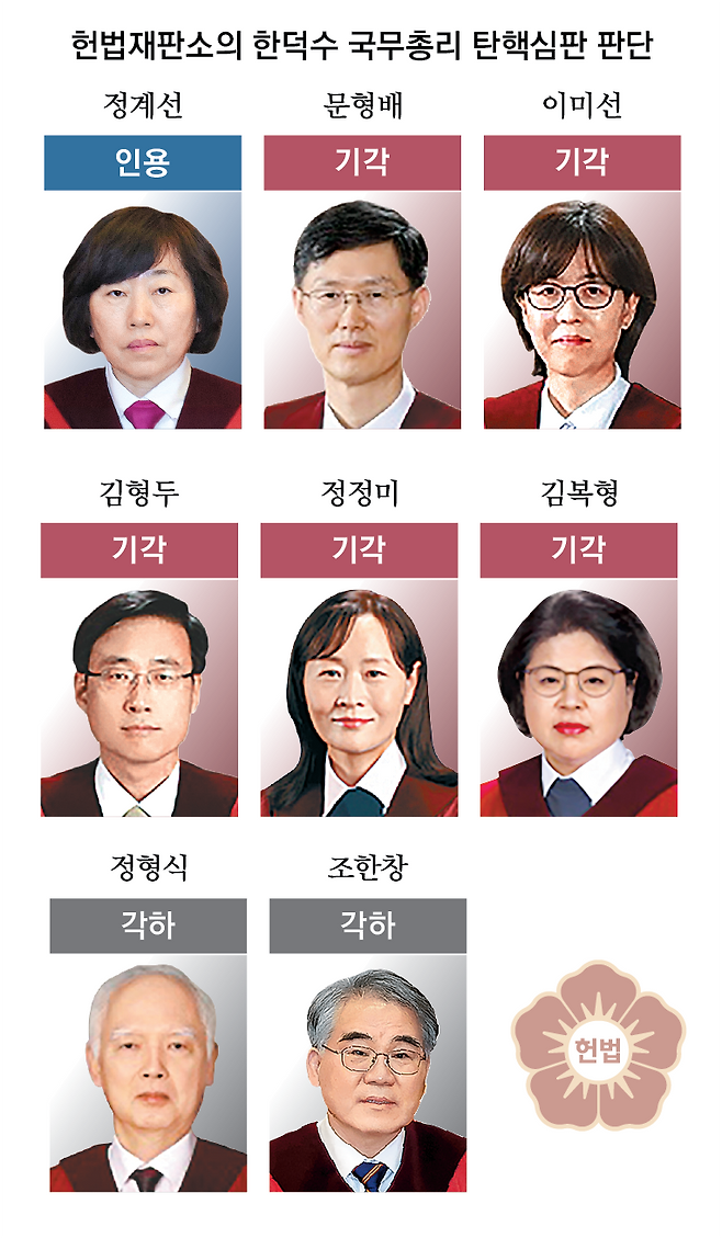 보수 성향으로 분류되고 윤 대통령과 국민의힘이 각각 지명한 정형식 조한창 재판관은 한 총리에 대한 탄핵 소추가 절차적으로 부적법하게 이뤄졌다며 ‘각하’해야 한다는 소수의견을 냈다. 국회가 대통령 권한대행인 한 총리를 탄핵하면서 대통령 기준 의결정족수(200석)를 적용해야 하는데도 총리 기준(151석)을 적용해 소추 절차에 흠결이 있는 만큼, 본안을 판단할 필요가 없다는 것이다. 두 재판관은 대통령 권한대행의 지위에 대해 “대통령의 궐위·사고라는 비상상황에서 직무의 공백 및 국가적 기능장애 상태 방지를 위하여 대통령의 권한을 대신하여 ‘대통령의 직무’를 수행하는 자”라며 “대통령 권한대행에 대한 탄핵소추 요건은 대통령의 경우와 동일하게 보는 것이 타당하다”고 밝혔다.