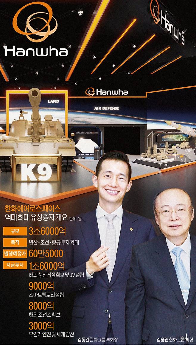 한화에어로스페이스는 유증 3조6000억원 중 1조6000억원을 글로벌 생산거점 확보 및 합작법인(JV) 설립 등에 투자한다는 계획이다. 또 전 세계적으로 수요가 급증한 추진장약(MCS) 스마트팩토리 설립에 9000억원, 미국의 해양방산 및 조선 산업기반 강화에 대응하기 위한 해외 조선소 확보에 8000억원, 무인기 엔진 및 체계 양산을 위해 3000억원을 투자하겠다고 덧붙였다.