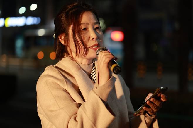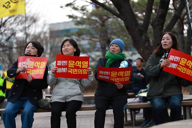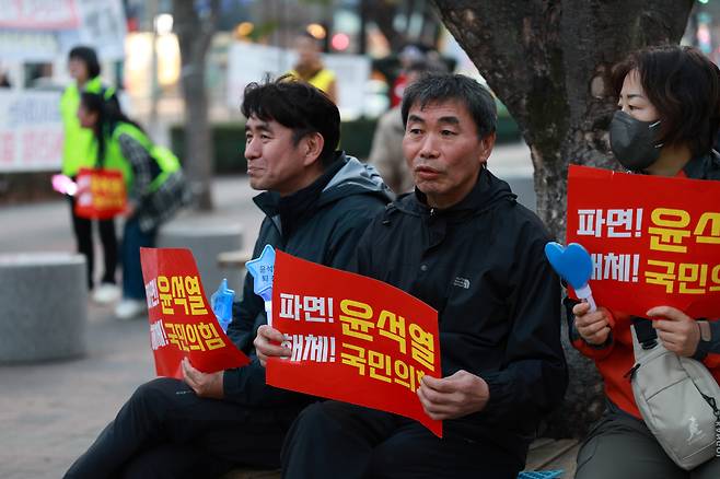 윤석열즉각퇴진 진주비상행동이 24일 저녁 진주시청 앞에서 열었던 "윤석열 석방 규탄, 윤석열 즉각 파면, 38차 진주시민대회"에 참석한 시민들이 사회자가 '헌재에 하고 싶은 말'을 묻자 보인 반응이다.