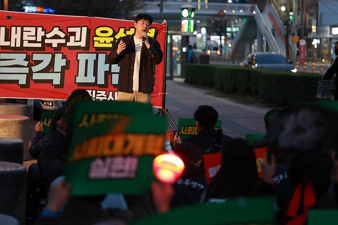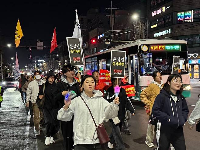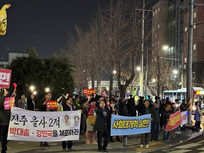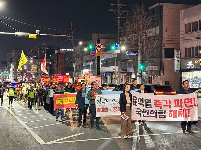 | ▲ 24일 저녁 진주시청 앞에서 열린 “윤석열 석방 규탄, 윤석열 즉각 파면, 38차 진주시민대회” |