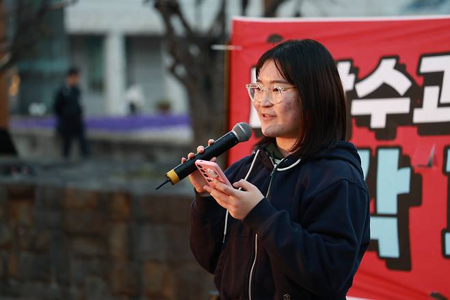 김희원 대학생은 "남들이 대신 나서주겠지, 나 하나는 가만히 있어도 되겠지 생각한 적도 있다. 하지만 즐거운 대학생활, 하기싫은 공부도 윤석열이 돌아오면 다시 하지 못할 수 있겠다는 생각에, 같이 든든하게 싸워온 학교 동기와 선배들도 감옥에 갈까봐 걱정이 들어 시간 날 때마다 집회에서 함께하고 있다"라며 "탄핵 결정이 이렇게 안 나올 줄 몰랐다. 명백한 위반, 모든 역사책에서 말하는 옳지못한 행동임에도 100일이 넘는 시간동안 시민을 찬바닥에 앉히고, 그는 구속에 풀려났다는 게 믿을 수가 없다. 더 이상은 못참겠다. 윤석열을 내일 당장 파면하라"고 이야기했다.