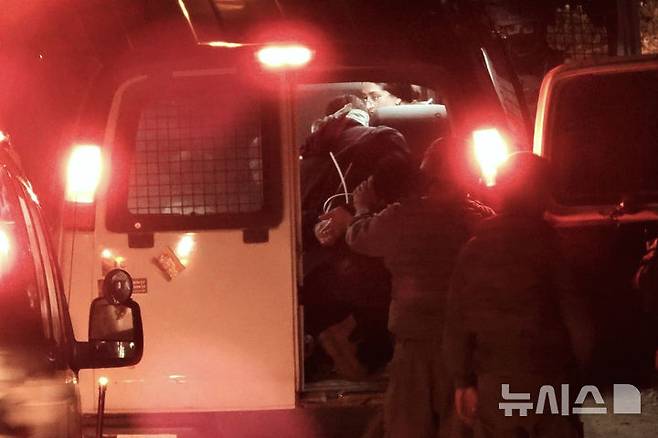 [서안지구=AP/뉴시스] 올해 아카데미 최우수 다큐멘터리상을 받은 팔레스타인-이스라엘 영화 '노 아더 랜드'의 팔레스타인 공동 감독 함단 발랄이 25일(현지 시간) 요르단강 서안지구 자택에서 이스라엘군에 체포돼 연행되고 있다. 2025.03.25.