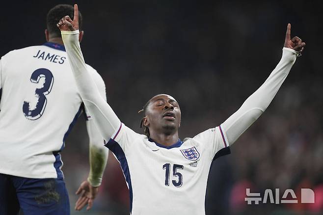 [런던=AP/뉴시스] 잉글랜드의 에베레치 에제가 24일(현지 시간) 영국 런던 웸블리 스타디움에서 열린 2026 국제축구연맹(FIFA) 북중미 월드컵 유럽 예선 조별리그 K조 2차전 라트비아의 경기 후반 31분 쐐기 골을 넣고 세리머니하고 있다. 에제는 A매치 데뷔 골을 기록했고 잉글랜드는 3-0으로 완승하며 조 선두를 유지했다. 2025.03.25.