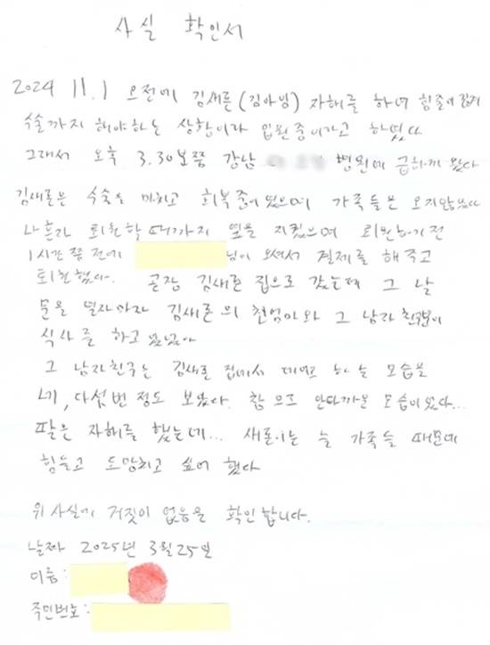 K씨는 자신의 제보와 증언의 신빙성을 담보하기 위해 직접 이름과 주민번호와 지장을 찍어 사실확인서를 작성했다. 김새론이 자해 후 서울 강남의 D병원 응급실 치료 당시 상황도 상세하게 적었다. K씨는 이 내용을 녹취 증거로 남기기 위해 녹음도 했다.