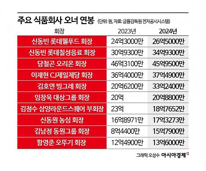 이재현 CJ그룹 회장은CJ제일제당에서 37억4900만원의 급여를 받았으며, 김호연 빙그레 회장은 33억2400만원을 수령했다. 이어 임창욱 대상그룹 회장(20억8800만원), 김정수 삼양라운드스퀘어 및 삼양식품부회장(18억7652만원), 신동원 농심 회장(17억3273만원), 김남정 동원그룹 회장(15억7900만원), 함영준 오뚜기 회장(13억6000만원) 등의 순이었다.